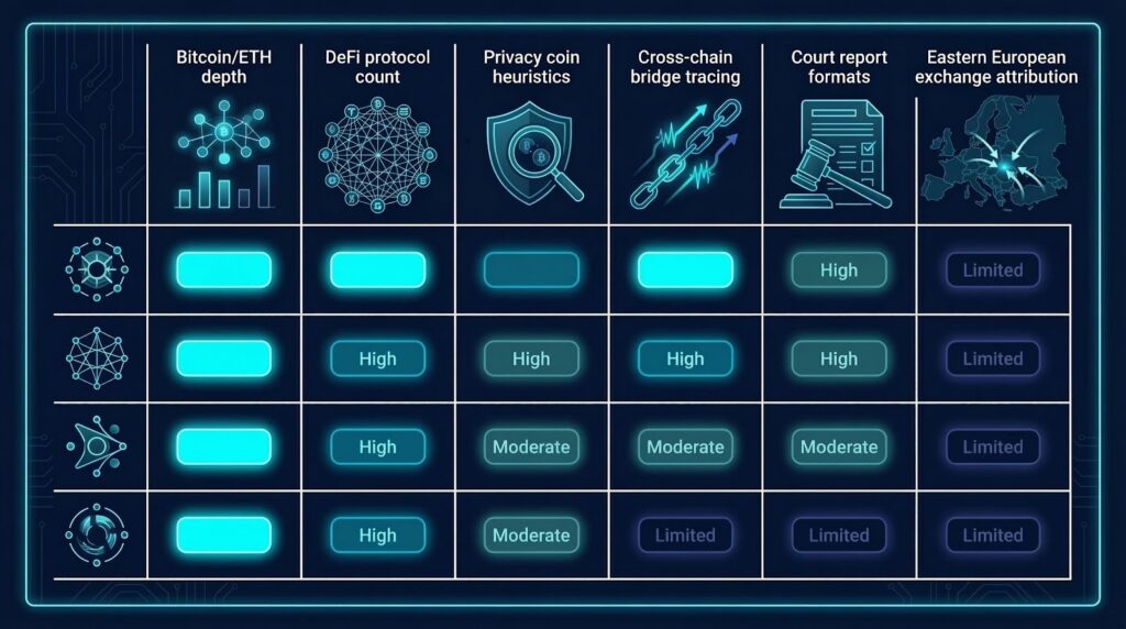 TRM Labs leads on raw chain count, supporting over 30 networks including major Layer 2 chains and cross-chain bridges. Elliptic covers a similar breadth with strong DeFi protocol mapping. Chainalysis provides deeper entity attribution on the chains it supports, particularly Bitcoin and Ethereum. Crystal Intelligence offers strong coverage for Eastern European and Russian-language exchange attribution. No single platform leads on every metric simultaneously, which is why specialist forensic firms cross-reference multiple platforms on complex investigations.