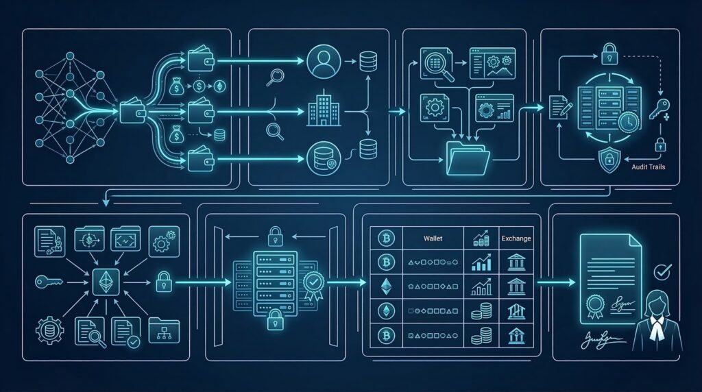 4. Chain of custody documentation. All data sources must be documented: which blockchain nodes were queried, which APIs were used, what data was downloaded and when. Hash values for downloaded datasets should be recorded to establish integrity.