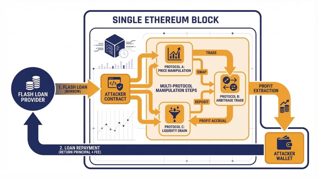 Flash loan forensics is defined as the investigation of attacks that exploit uncollateralized flash loan mechanisms, where a borrower can access millions of dollars in liquidity for the duration of a single transaction block without posting any collateral, provided the loan is repaid before the block closes. Flash loans enable attackers to temporarily control enormous capital, use it to manipulate DeFi protocol parameters or exploit pricing vulnerabilities, and profit from the manipulation before repaying the loan, all within a single block’s execution time.