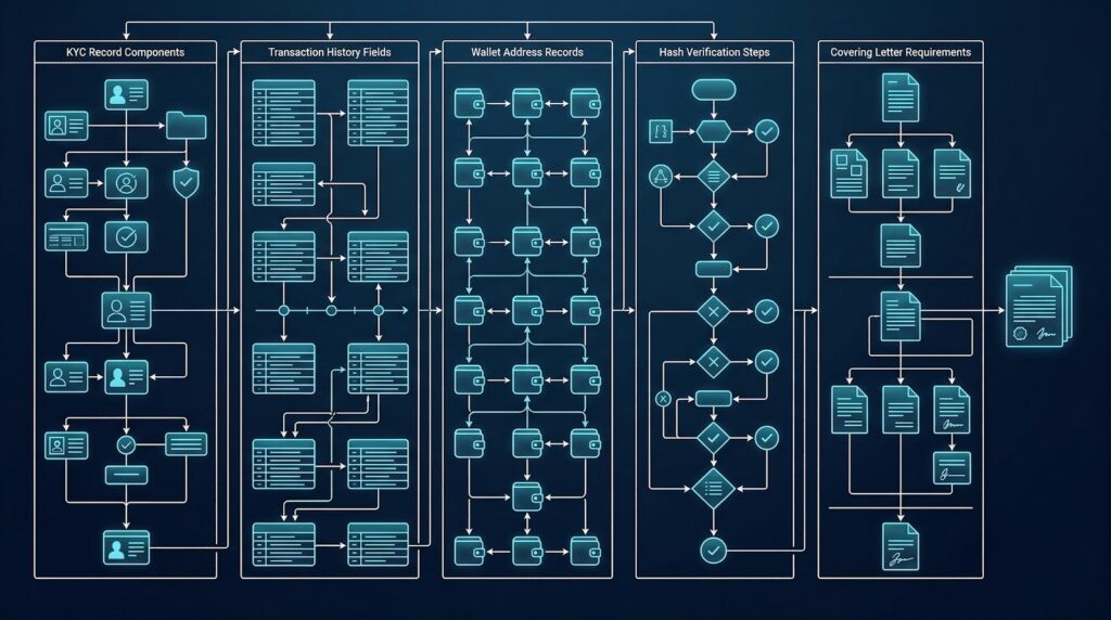 For KYC records, the production should include: the full legal name, date of birth, and address as verified at onboarding; the verification documents provided and the date of verification; the current verification status and any subsequent re-verification events; and any enhanced due diligence records if the customer was subject to higher-risk procedures. For transaction records, the production should include: a complete transaction history in chronological order; wallet addresses associated with the account; deposit and withdrawal records including counterparty exchange and transaction hashes where available; and any internal notes, flags, or SAR references associated with the account.