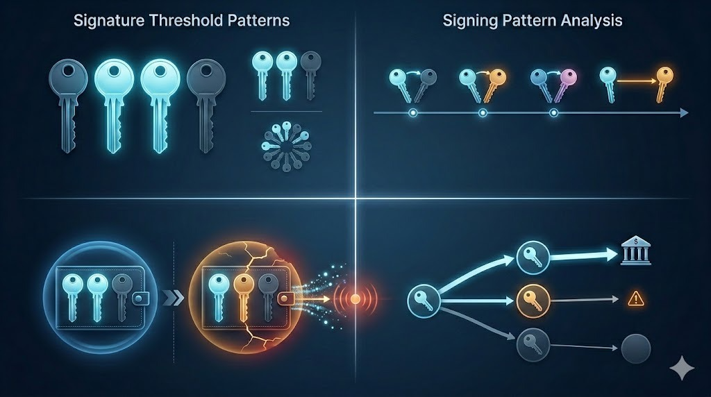 Signing pattern correlation tracks which key combinations authorize which transactions revealing operational hierarchies. When Key A and Key B consistently sign routine transfers while Key A and Key C sign large withdrawals, investigators infer Key A holds primary operational control while Keys B and C serve different functional roles. This pattern analysis exposes organizational structures invisible through single-signature wallet analysis.