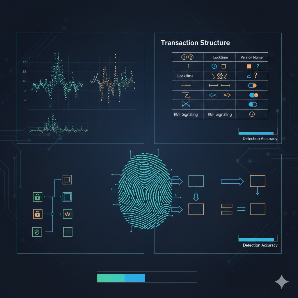 Transaction structure parameters include version numbers, locktime settings, input/output ordering, and script types. Bitcoin Core typically uses version 2 with locktime set to current block height. Electrum often uses version 1 with zero locktime. These choices create binary classification signals.