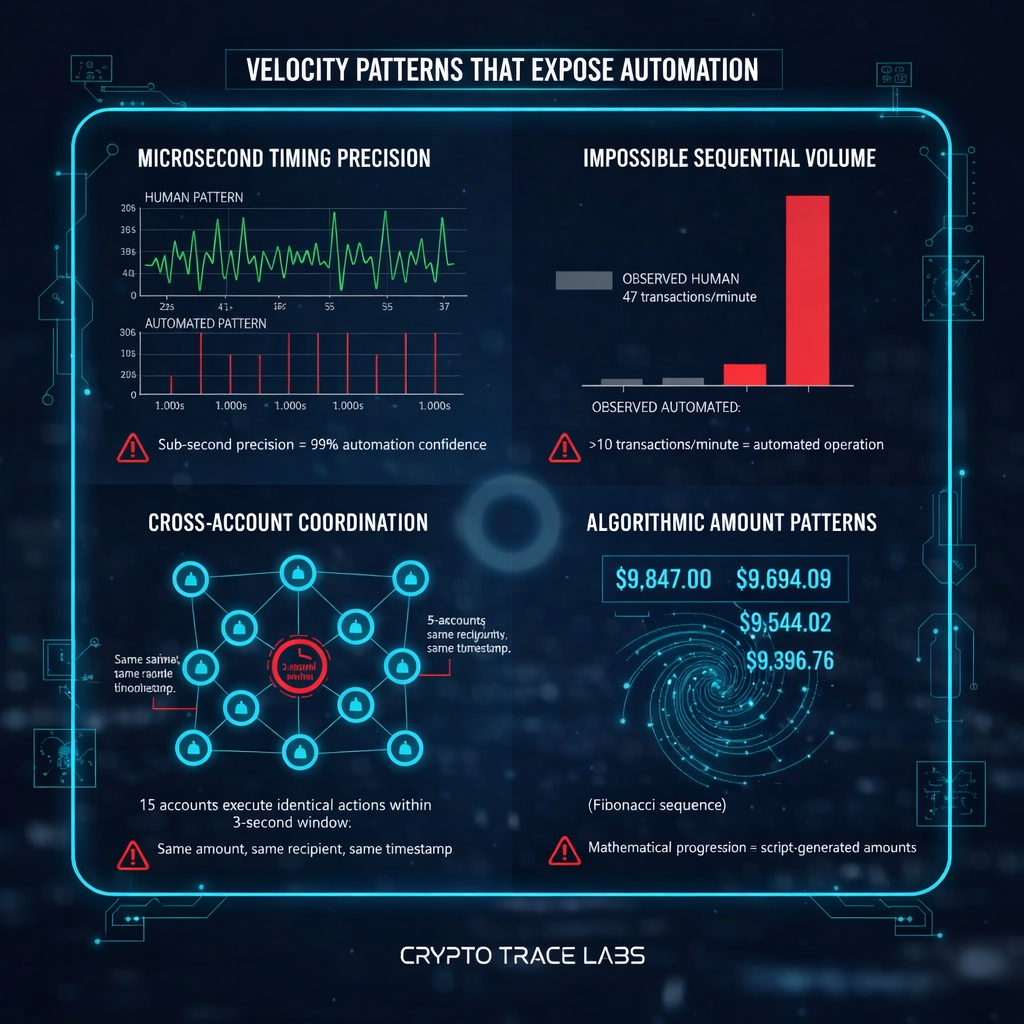 Automated criminal systems typically execute transactions in under 2 seconds per transfer, with some bot networks achieving sub-millisecond speeds across multiple exchanges simultaneously. Human operators realistically need 30-90 seconds per transaction to verify details and confirm transfers. This speed differential creates the core detection opportunity, as investigators use statistical analysis to identify accounts operating beyond human processing capabilities. Crypto Trace Labs uses this gap as a primary automation indicator in on-chain tracing investigations.