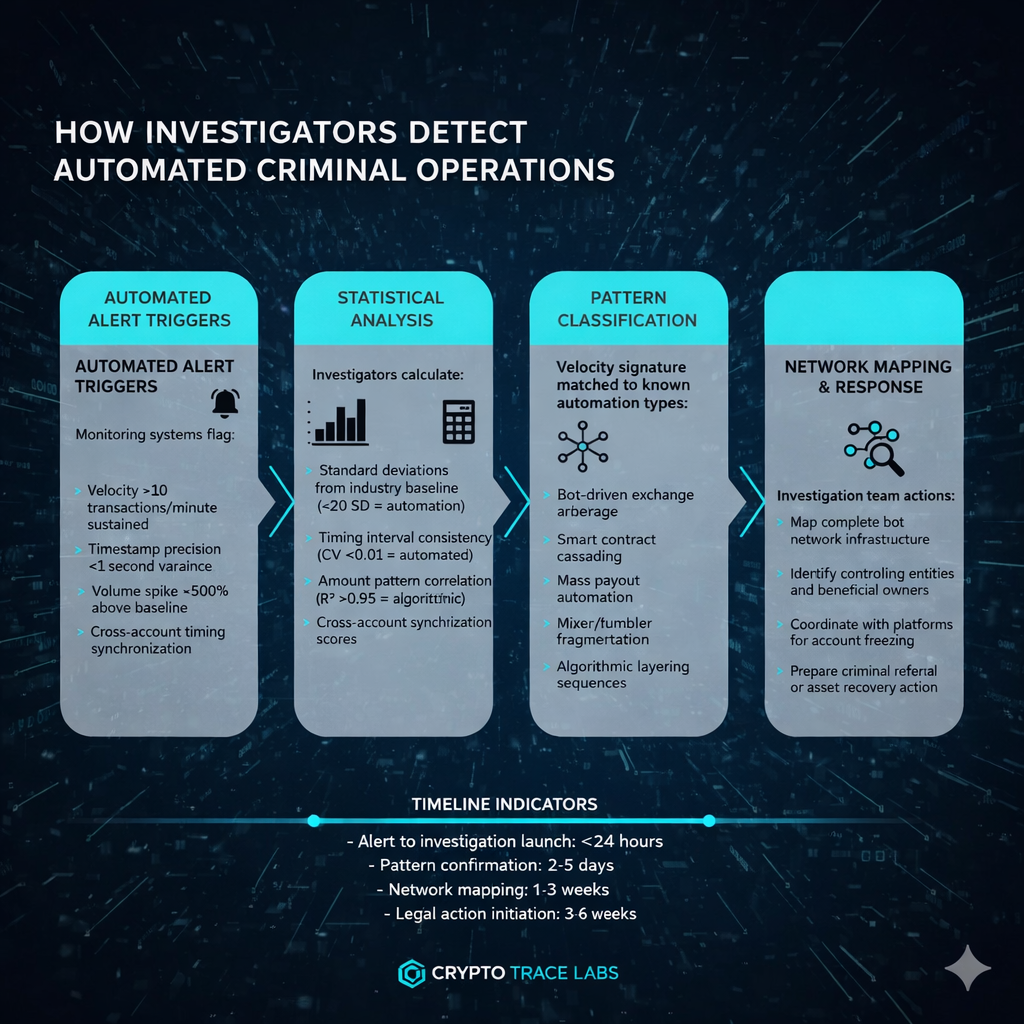 Investigators combine blockchain analytics platforms such as Chainalysis and Elliptic with custom statistical modeling and machine learning systems trained on millions of transaction records. These tools calculate standard deviations from baseline activity, identify timing interval consistency, and score cross-account synchronization patterns. Blockchain-specific analysis examines gas prices, nonce sequencing, and confirmation timing for additional automation indicators. Specialized forensic teams also develop proprietary algorithms targeting emerging automation techniques.