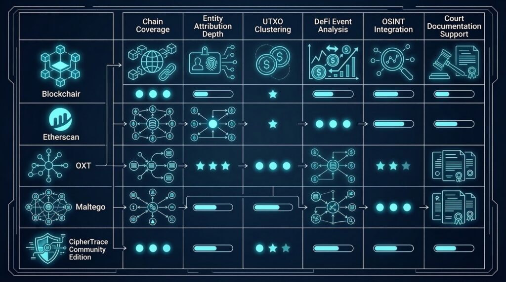 For Bitcoin UTXO-based investigation, OXT provides the most useful visualisation of transaction graphs and UTXO clustering patterns without requiring a commercial licence. For Ethereum and ERC-20 investigations, Etherscan provides complete smart contract event log access, making it the primary tool for NFT tracing and DeFi event analysis.