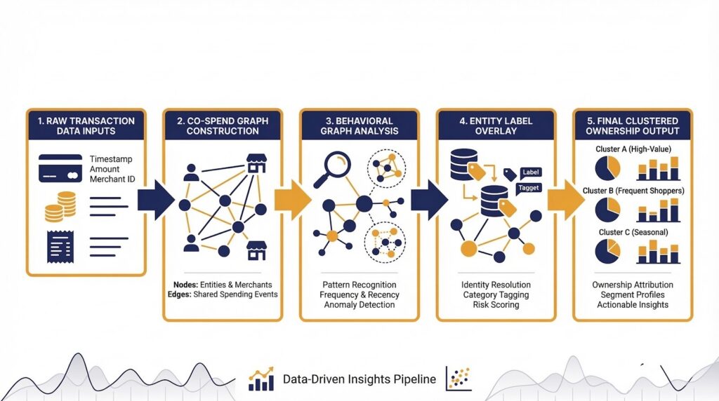 - Graph-based clustering detects behavioral patterns across millions of addresses: Modern blockchain analytics platforms apply graph neural networks and network analysis to identify ownership clusters from spending pattern similarities, not just direct co-spend events.