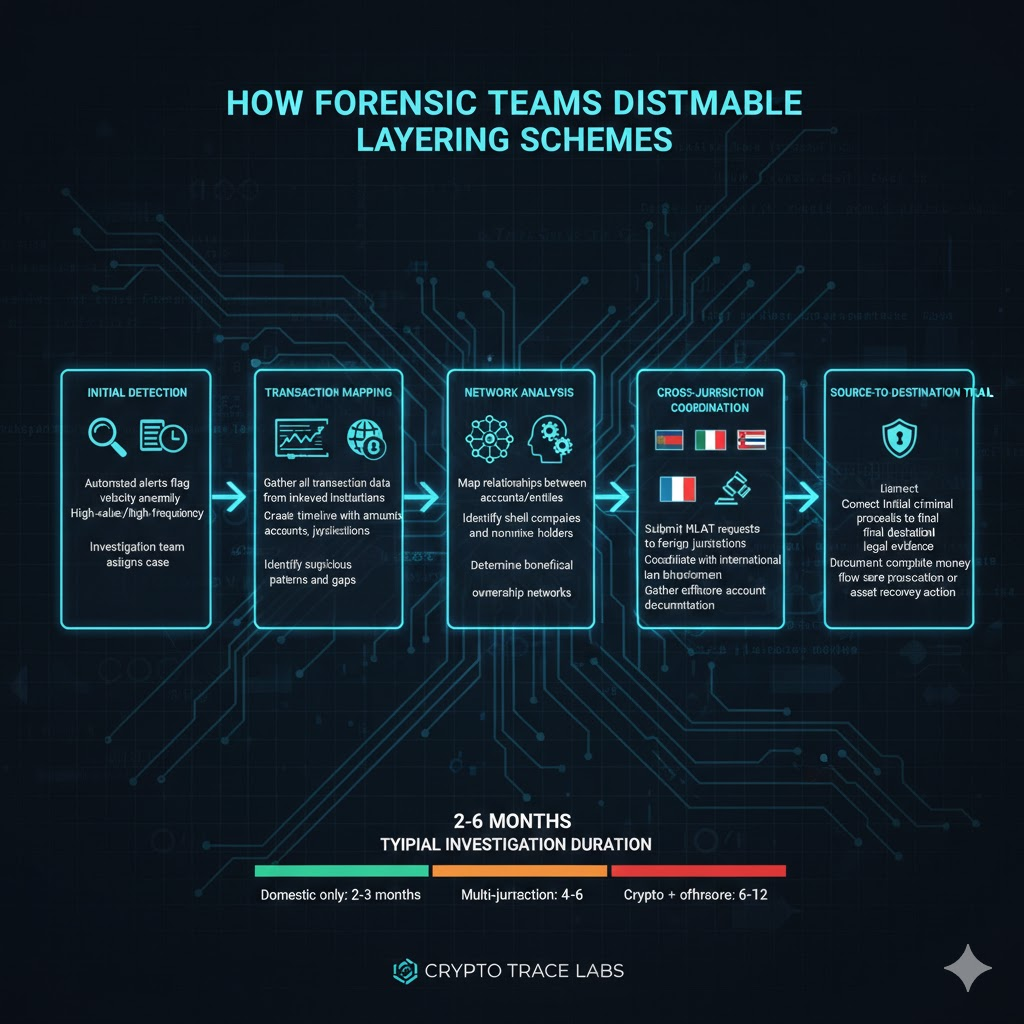 Layering creates investigative difficulty through volume, velocity, and jurisdictional fragmentation. Criminals execute dozens of transactions within hours, moving funds through offshore accounts in multiple countries. Each transaction layer adds complexity requiring additional documentation requests and timeline reconstruction.