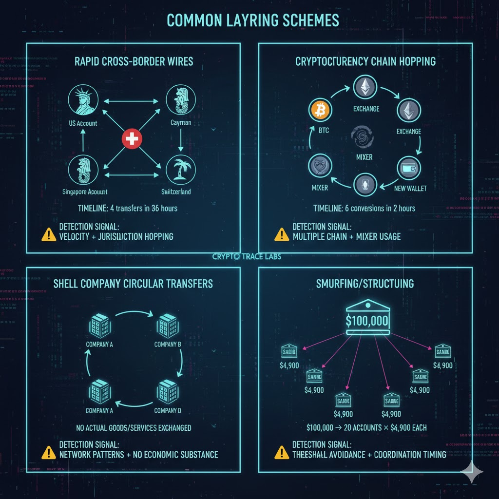 - Layering creates investigative complexity through volume (100+ transactions), velocity (hours not days), and jurisdictional fragmentation across multiple countries