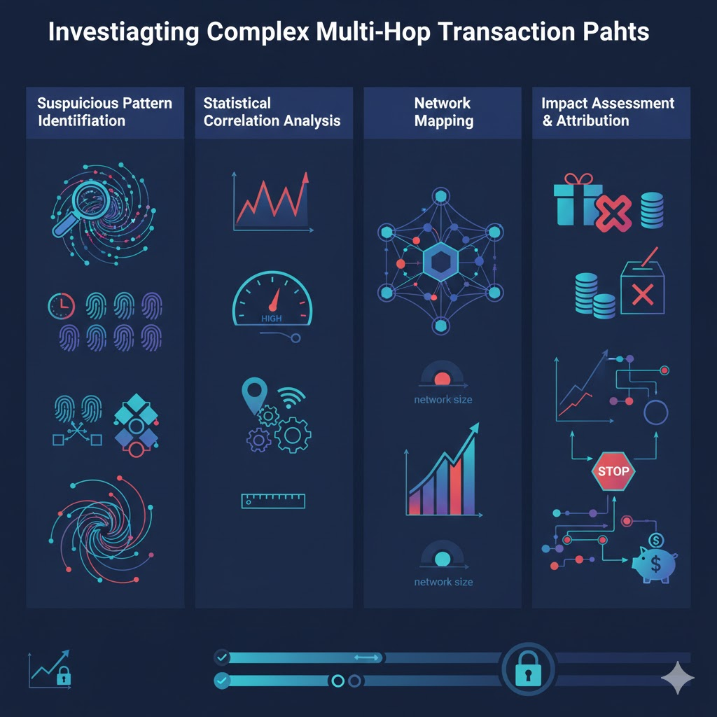 Money laundering obfuscation fragments stolen funds across extensive Sybil networks creating investigative complexity. Rather than moving $1M through 10 addresses, criminals split across 500 addresses each processing $2,000, overwhelming manual analysis capabilities.