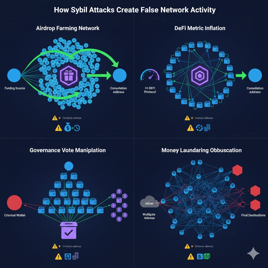 Criminal applications exploit protocol assumptions about user independence. DeFi platforms reward unique participation, airdrop distributions allocate to diverse holders, governance systems weight independent votes. Sybil attacks undermine these assumptions creating false diversity enabling disproportionate rewards, voting manipulation, or metric inflation.