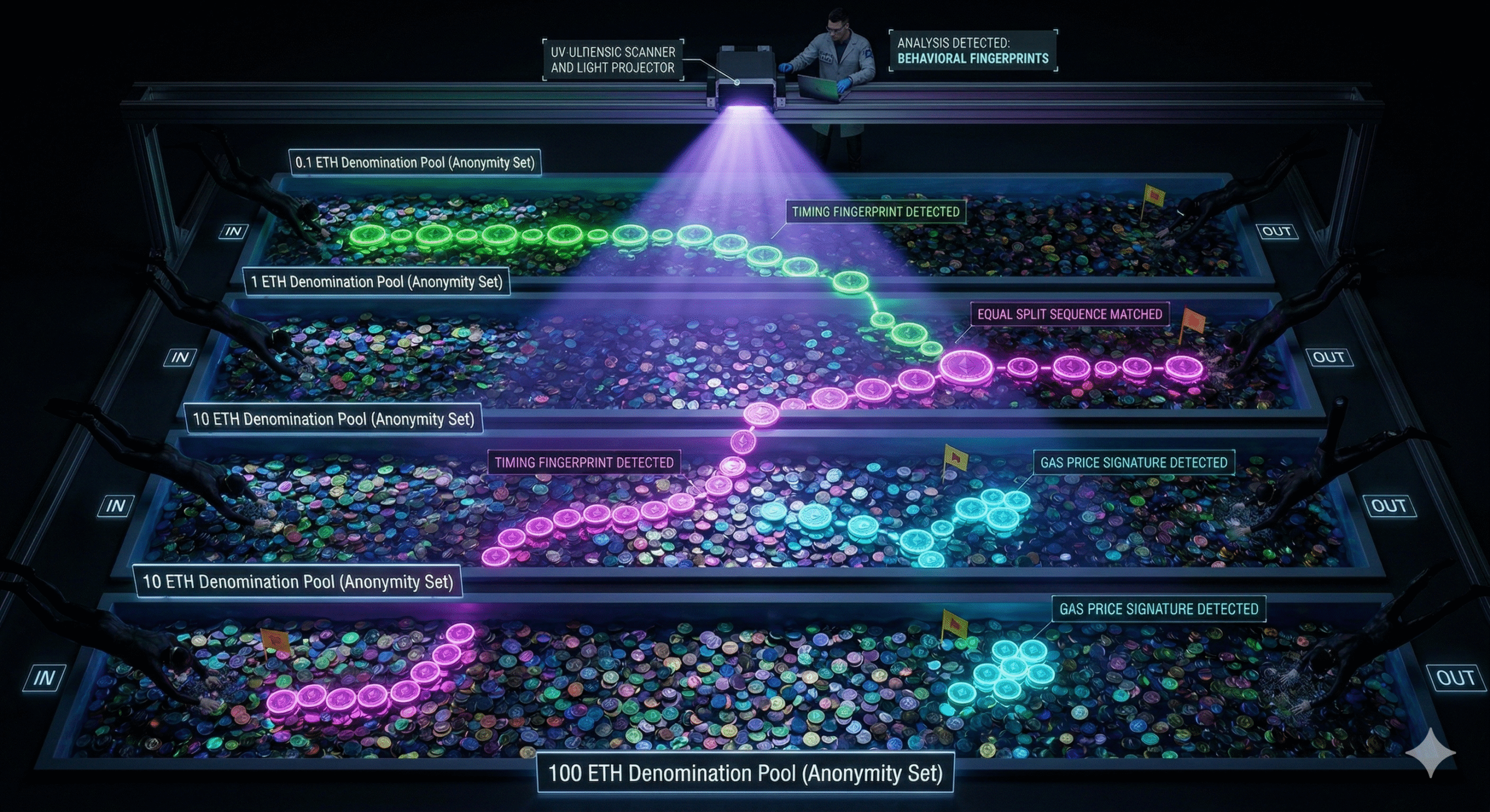 - Five pattern categories reduce anonymity sets: split deposit sequences, time-correlated clusters, gas price fingerprinting, multi-hop obfuscation chains, and cross-chain entry patterns.