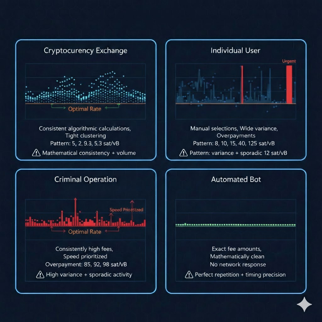 - Fee patterns create behavioral fingerprints distinguishing exchanges (algorithmic consistency), individual users (manual variability), criminals (speed priority), and automated systems (mathematical precision)