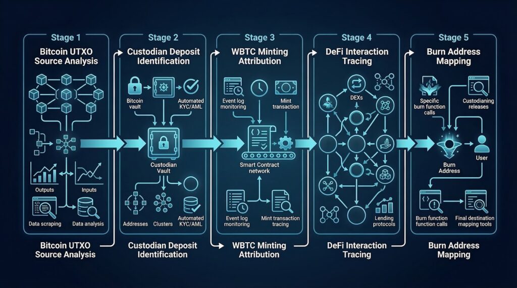 When WBTC enters lending protocols like Aave, liquidity pools like Uniswap or Curve, or yield aggregators, investigators must trace each smart contract interaction using Ethereum event log analysis before the WBTC burn can be linked to the original Bitcoin holder. Each protocol interaction adds contract addresses and intermediate token swaps. Elliptic Investigator and Chainalysis Reactor support multi-hop DeFi tracing, allowing investigators to follow WBTC through complex protocol chains back to the original minting address and its associated Bitcoin source.